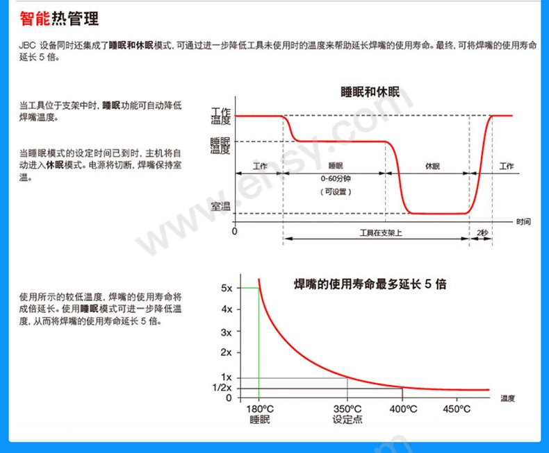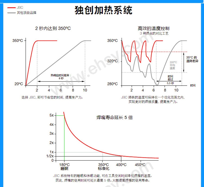 JBC長壽命焊嘴能夠實現(xiàn)瞬時加熱,具有卓越的熱傳遞性能和良好的耐用性。得益于特有的加熱系統(tǒng)以及睡眠與休眠特性,使用壽命比其他品牌產品長5倍。